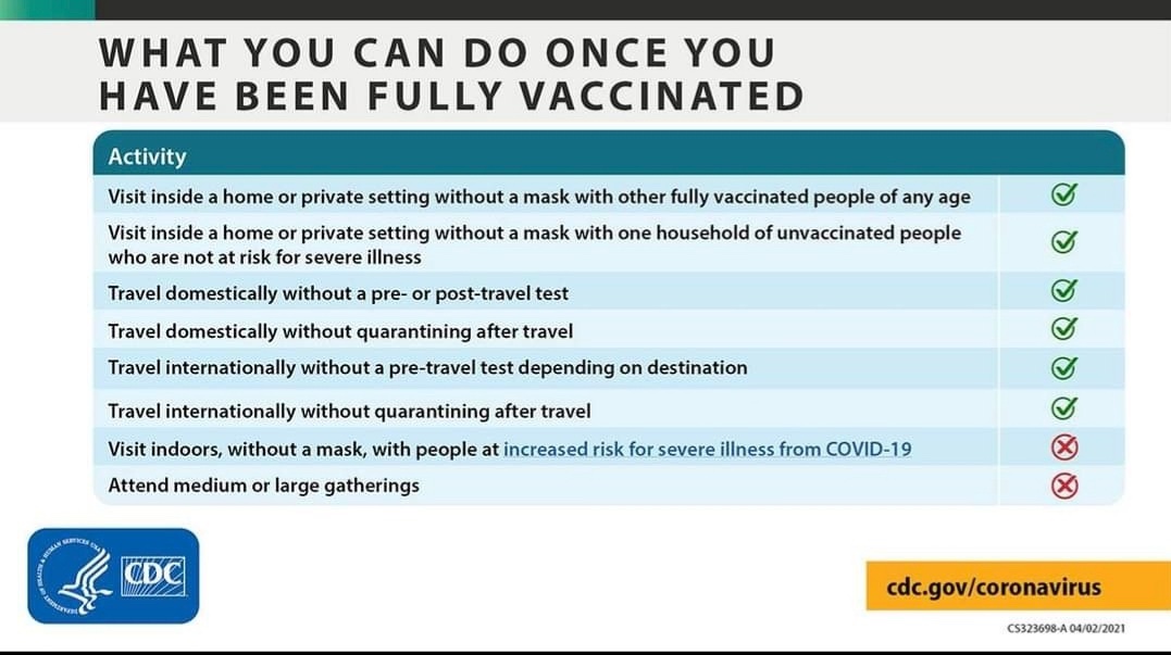 What can you do and what shouldnt you do after completing 2 doses of Vaccination? The CDC has come out with some suggestions recently. Vaccinated individuals can meet indoors without masks unvaccinated individuals provided nobody in that house is at risk for severe covid (i.e., very old, very obese or patients with severe heart disease, lung disease, kidney failure or after organ transplantation or on strong immuno- suppresssive medications). So if you are fully vaccinated, you can now meet your children or grandchildren without masks and even hug them! You could also have a wedding reception for 50 people at a hotel provided that all of them ( invitees as well as staff) are vaccinated. I would also say say that you could also have a party for your friends at home using the same restrictions provided all of you have been fully vaccinated. Basically the CDC seems to be saying that you can have a near normal life if everyone you are in contact with, is fully vaccinated. Therefore to simplify this recommendation – you could meet in groups without wearing masks provided everyone has taken 2 shots of the vaccine and that none of the attendees have high risk features for severe covid and none of them have travelled long distance recently.