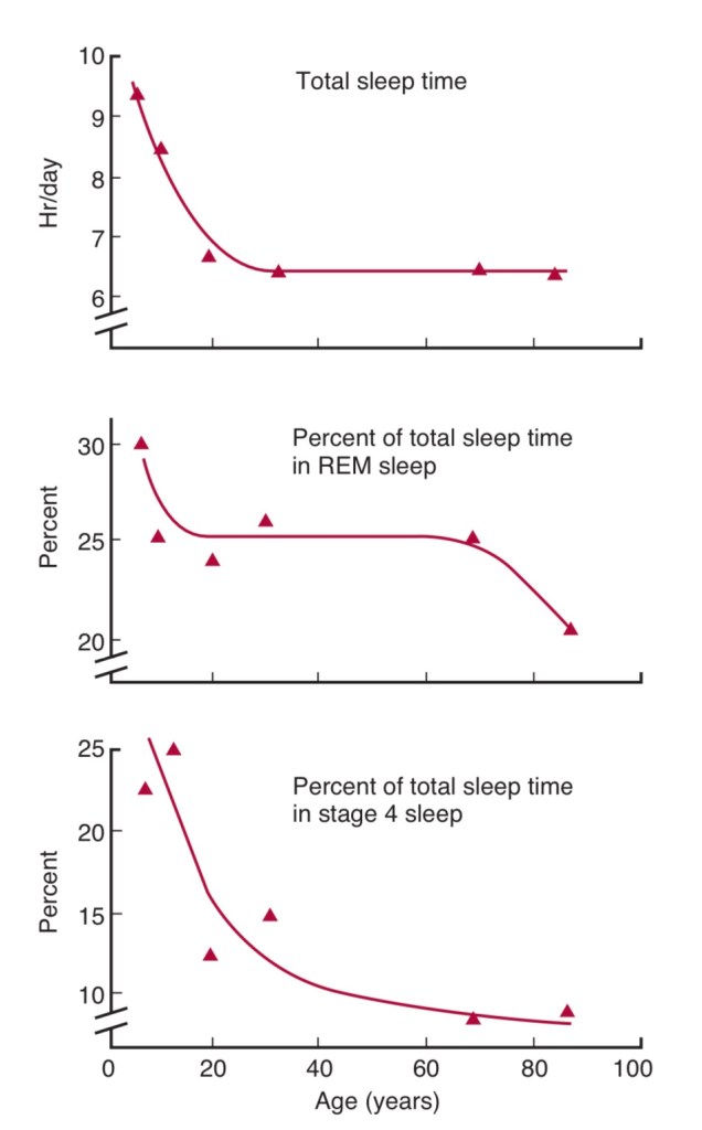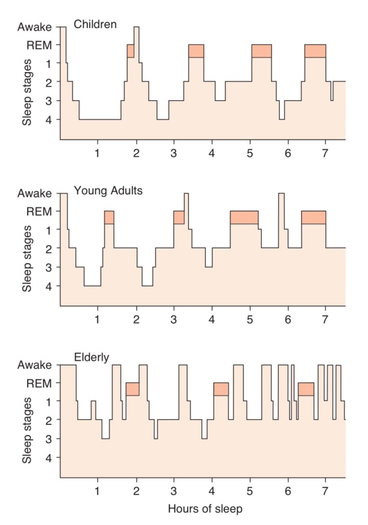 REM sleep deprivation leads to sleep that is not restful. More time is spent in stage 3-4 during the first half of the sleep period. In the second half, more REM sleep happens as shown in the diagram. As REM sleep is most restful, staying awake during this period (between midnight to 4AM) has health consequences. Younger children especially newborns spend much longer times in stage 4 sleep and REM sleep. REM sleep duration reduces with ageing to much less than the 25% enjoyed by young adults.