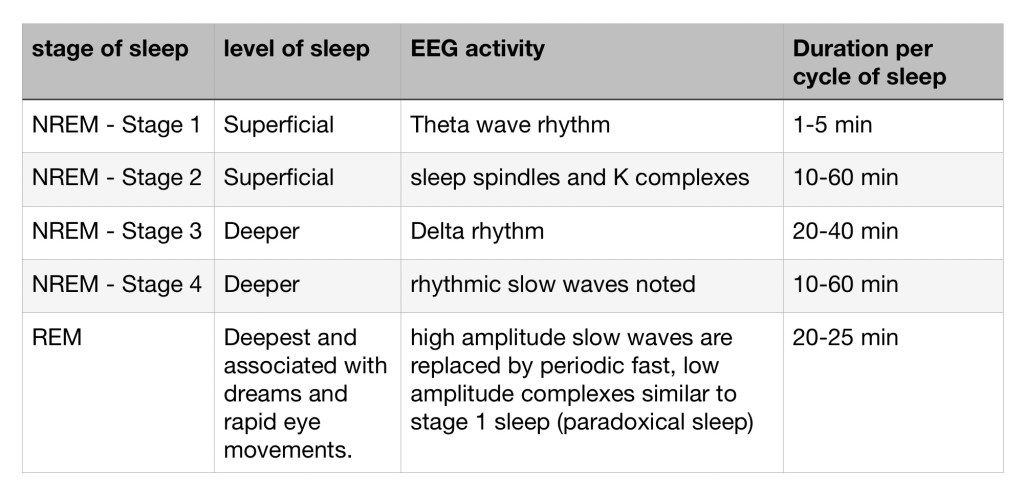 Sleep occurs in cycles that last 90-110mins (i.e., less than 2 hr). Each cycle has 2 types of sleep, NREM (non rapid eye movement or slow wave sleep) and REM (Rapid eye movement sleep). NREM has 4 stages 1,2,3 &4). When we close our eyes to sleep , we are in stage 1 and we gradually move into the other stages as we continue to sleep. Stages 1 and 2 are the lighter planes of sleep and 3 and 4 are the deeper planes. Throughout each stage the body relaxes progressively and the EEG (brain activity) changes and slows down.